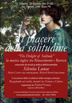 Il concerto propone una serie di composizioni di John Dowland, Thomas Campian, Henry Purcell, ed altri compositori inglesi. Una caratteristica di questo programma, è l’attenzione ad un clima di “soave diletto”. La bellezza della musica speculativa di questo periodo è infatti proprio nel saper fondere una linea di purezza di pensiero con l’attenzione all’animo, ai sentimenti, al muovere alle passioni l’ascoltatore. Una musica che arricchisce il “diletto della solitudine”e dunque l’intrattenimento ricercato per nutrire lo spirito e l’intelletto e non per una semplice gratificazione dei sensi.